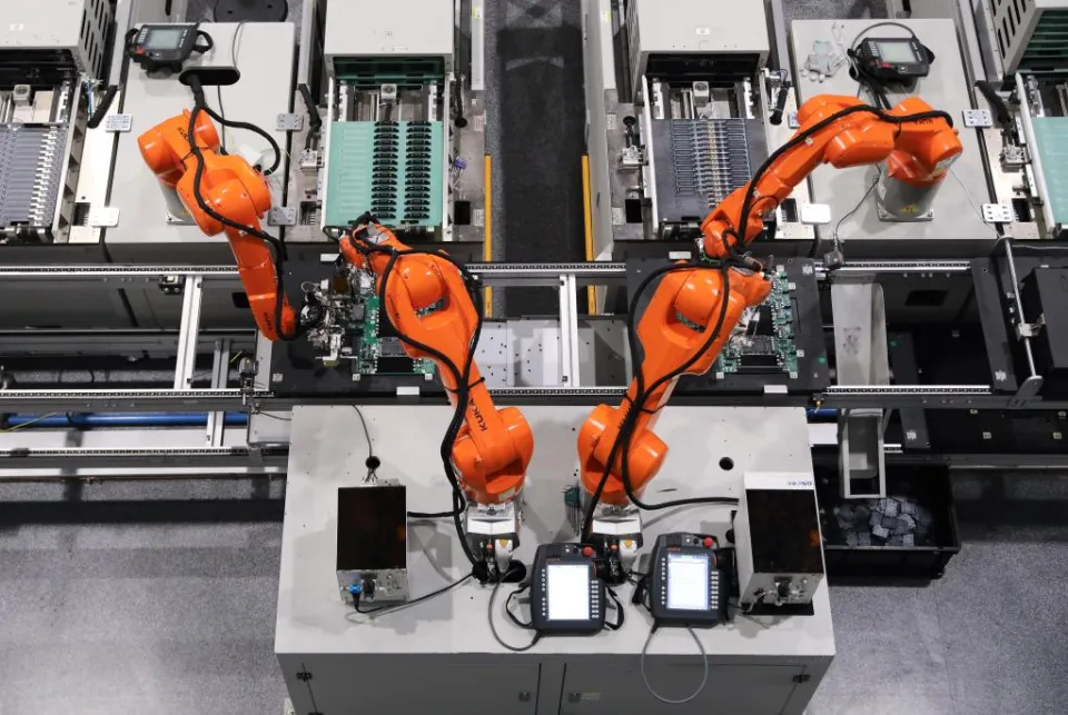 創(chuàng)新是新型工業(yè)化的根本動力。2023年底召開的中央經(jīng)濟工作會議部署今年經(jīng)濟工作時指出,以科技創(chuàng)新引領(lǐng)現(xiàn)代化產(chǎn)業(yè)體系建設(shè)。歲末年初,新華社記者走訪工程機械、新能源汽車、電子信息等企業(yè),觀察創(chuàng)新如何改變工廠、產(chǎn)業(yè)鏈和產(chǎn)品,探尋先進制造新趨勢。工廠:看得見的智能,看不見的積淀越來越多用戶個性化訂購汽車,從車身顏色到輪轂大小都不一樣,工廠如何承接多樣化的訂單?近日,在蔚來合肥第二生產(chǎn)基地,記者看到8萬平方米的車身車間里700多臺橙色機器人各司其職。涂裝車間設(shè)有“魔方”車輛存取平臺,改變以往涂裝車間按訂單順序涂裝顏色、不停更換噴槍的方式,把平面庫存優(yōu)化為立體空間,設(shè)置6層408個車位,減少生產(chǎn)停頓。總裝車間用“飛地”自動裝配島,將前后風(fēng)擋、玻璃車頂、儀表臺、尾門四大件集成在同一個全自動裝配島完成安裝。這是2023年10月10日拍攝的蔚來合肥第二生產(chǎn)基地。新華社發(fā)“自動裝配島用并行制造方案替代串行制造方案,讓車間流水線的‘單行道’變成了‘立交橋’,整體調(diào)試周期比傳統(tǒng)方案縮短三分之二?!蔽祦砗戏蕝^(qū)域公司總經(jīng)理余東明說,工廠實現(xiàn)高效柔性化生產(chǎn),可滿足350多萬種個性化配置組合,從收到訂單到整車下線僅需14天。以人工智能、大數(shù)據(jù)、工業(yè)互聯(lián)網(wǎng)為代表的數(shù)字技術(shù)成為引領(lǐng)新一輪產(chǎn)業(yè)變革的關(guān)鍵力量,正在改變著越來越多的中國工廠:在小米手機“黑燈工廠”,一部手機從無到有的200多道工序大部分靠智能設(shè)備完成。每隔40秒,一塊貼滿1500多個元器件的主板從貼片機里送出,被AGV小車運到測試環(huán)節(jié)軌道上,機械手依次把主板送到測試點。在徐工集團輪式起重機產(chǎn)業(yè)制造基地,5毫米至30毫米厚的鋼制板材經(jīng)過智能化分揀、自動化組焊、無人化加工等工藝,每25分鐘能組裝下線一臺約有5200個零部件、重量達34噸的起重機。海爾洗衣機互聯(lián)工廠應(yīng)用“5.5G”、先進算法和數(shù)字孿生等技術(shù),實時追蹤上千輛物料車的全流程軌跡并調(diào)度,還有自檢自查總裝效率、智能推薦效率優(yōu)化方案的能力,實現(xiàn)降本提效……數(shù)據(jù)顯示,截至2023年12月底,我國已培育421家國家級示范工廠、萬余家省級數(shù)字化車間和智能工廠。加快制造業(yè)數(shù)字化轉(zhuǎn)型是順應(yīng)新工業(yè)革命趨勢、提升工業(yè)現(xiàn)代化水平、建設(shè)現(xiàn)代化產(chǎn)業(yè)體系的必然要求。工業(yè)和信息化部新聞發(fā)言人、運行監(jiān)測協(xié)調(diào)局局長陶青表示,工信部將堅持以推進信息化與新型工業(yè)化深度融合為主線,筑牢基礎(chǔ),一體推進,摸清企業(yè)轉(zhuǎn)型需求和痛點