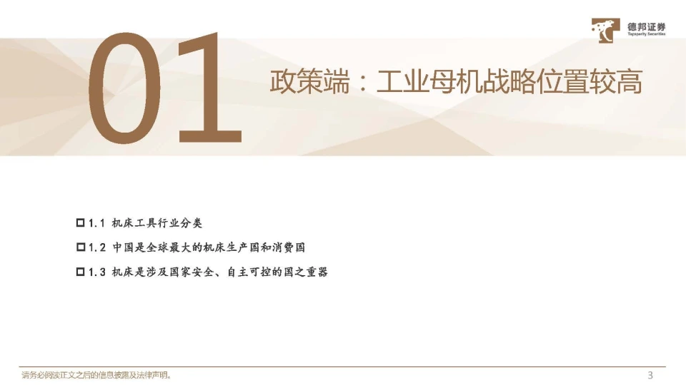 政策端:工業(yè)母機戰(zhàn)略位置較高機床工具行業(yè)可分為八個細分行業(yè),廣泛用于制造業(yè)根據(jù)中國機床工具工業(yè)協(xié)會的統(tǒng)計分類標準,機床分為金屬切削機床、金屬成形機床、鑄造機械、木工機械等4個主 機行業(yè),以及機床附件、工具及量具量儀、磨料磨具和其他金屬加工機械等4個輔機行業(yè)或配套部件行業(yè)。 機床作為高端裝備制造業(yè)的“工業(yè)母機”,數(shù)控機床產(chǎn)品用途非常廣泛,下游客戶包括傳統(tǒng)機械行業(yè)、汽車行業(yè)、電 力設(shè)備、鐵路機車、船舶、國防工業(yè)、航空航天工業(yè)、石油化工、工程機械、電子信息技術(shù)工業(yè)以及其他加工工業(yè)。中國是全球最大的機床生產(chǎn)國和機床消費國從世界范圍內(nèi)來看,中國、美國、德國、日本、意大利是機床生產(chǎn)、消費的主要國家/地區(qū)。其中,德國、日本機床行業(yè) 憑借較強的技術(shù)積累與市場競爭力凈出口規(guī)模較大,中國、美國為機床凈進口國家。中國是全球制造業(yè)的中心,隨著中國經(jīng)濟 的快速發(fā)展和固定資產(chǎn)投資的增加,中國機床市場發(fā)展前景廣闊。機床產(chǎn)業(yè)鏈補短板進程有望加快機床上游產(chǎn)業(yè)鏈圖譜機床產(chǎn)業(yè)鏈上游主要包括數(shù)控系統(tǒng)、電氣元件、精密件和功能部件、鑄件及版焊件。機床上游產(chǎn)業(yè)鏈對海外廠商依賴 較高,國家推出一系列“強鏈補鏈”政策,加快補短板、強弱項。2023年3月16日,國務(wù)院國資委黨委在《人民論壇》發(fā)表 署名文章《國企改革三年行動的經(jīng)驗總結(jié)與未來展望》,其中指出將乘勝而上實施新一輪國企改革深化提升行動,更大力 度布局前瞻性戰(zhàn)略性新興產(chǎn)業(yè)。加大在集成電路、工業(yè)母機等領(lǐng)域加快補短板強弱項。強化在產(chǎn)業(yè)鏈循環(huán)暢通中的支撐帶 動作用。持續(xù)推動基礎(chǔ)固鏈、技術(shù)補鏈、優(yōu)化塑鏈、融合強鏈。圍繞產(chǎn)業(yè)鏈部署創(chuàng)新鏈,加快在重要領(lǐng)域和節(jié)點實現(xiàn)自主 可控,增強國內(nèi)大循環(huán)內(nèi)生動力和可靠性。機床核心零部件—數(shù)控系統(tǒng)數(shù)控系統(tǒng)是數(shù)控機床裝備的“大腦”,直接影響數(shù)控機床裝備的 功能、性能、和技術(shù)水平的高低。 數(shù)控系統(tǒng)是數(shù)字控制系統(tǒng)的簡稱,根據(jù)計算機存儲的控制程序, 執(zhí)行部分或全部 數(shù)值控制功能,并配有接口電路和伺服驅(qū)動裝置的專 用計算機系統(tǒng)。通過利用數(shù)字、文字和符號組成的數(shù)字指令來實現(xiàn)一臺 或多臺機械設(shè)備動作控制,它所控制的通常是位置、角度、速度等機械 量和開關(guān)量。機床核心零部件—主軸電主軸是數(shù)控機床的重要組成部件,具有結(jié)構(gòu)緊湊、重量輕、慣量小、性能良好等特點。電主軸是將主軸和電動機融 合在一起,其優(yōu)勢在于實現(xiàn)了機床的“零傳動”,提高傳動效率,可實現(xiàn)超高速轉(zhuǎn)動,